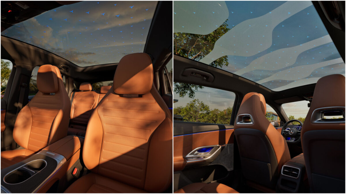 達人小七看見實車的水箱護罩,細密背光點陣與隱藏式星徽元素,整體辨識度明顯提升,有900多顆LED組成,可以做出光型變化,覺得相當酷炫,而主持人蘇宗怡提到頭燈與尾燈裡面有三芒星的呈現,非常具有未來感,甚至車內的天窗都有三芒星元素,配備Sky Control的星光玻璃車頂。打開前廂蓋,裏頭沒有引擎,而是128公升大容量的置物空間,可以放得下登機箱、軟包。